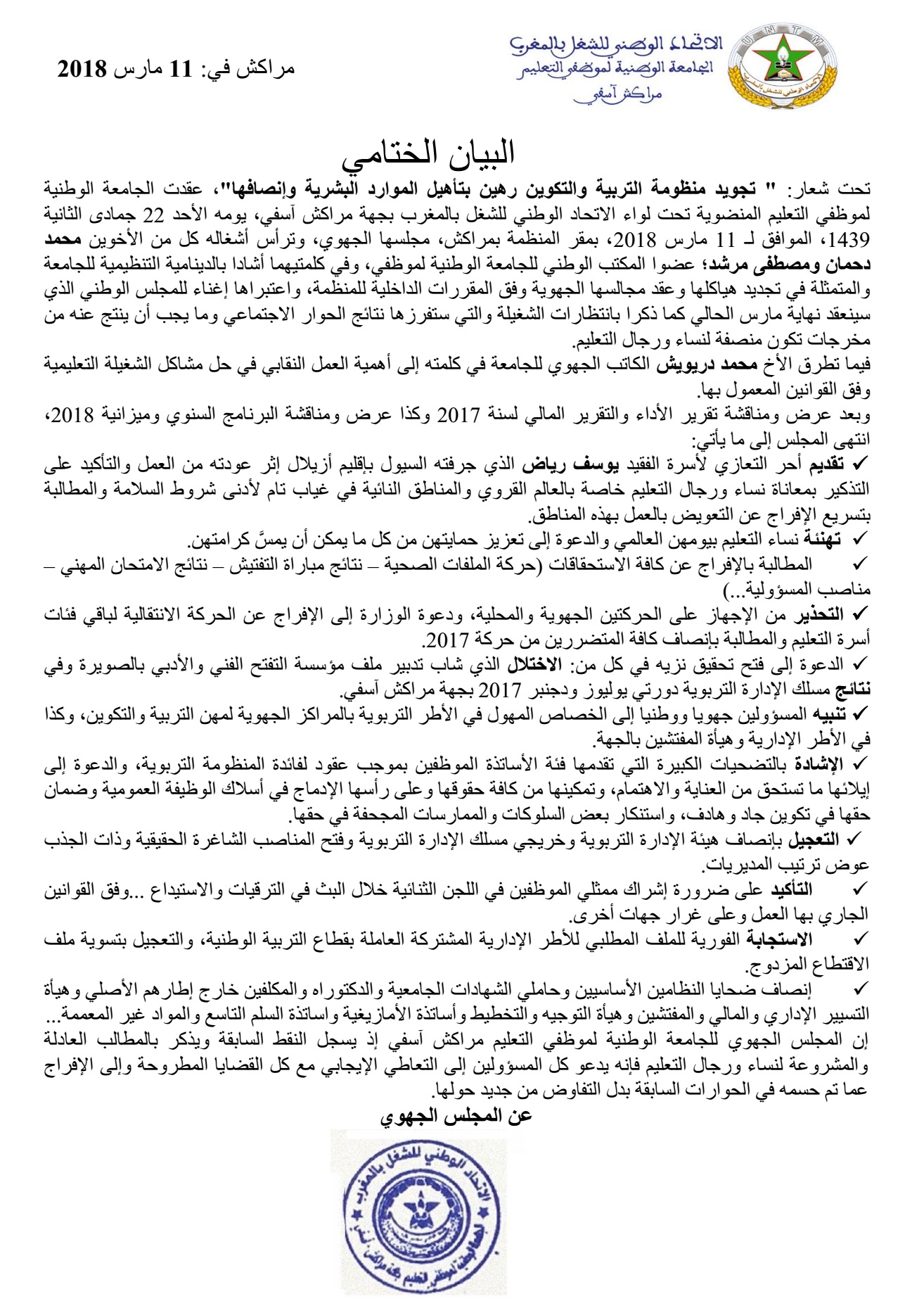 ونبهت الجامعة خلال المجلس الجهوي الذي نظم تحت شعار : ” تجويد منظومة التربية والتكوين رهين بتأهيل الموارد البشرية وإنصافها”؛ المسؤولين جهويا ووطنيا إلى الخصاص المهول في الأطر التربوية بالمراكز الجهوية لمهن التربية والتكوين، وكذا في الأطر الإدارية وهيأة المفتشين بالجهة، داعية الوزارة إلى الاستجابة الفورية للملف المطلبي للأطر الإدارية المشتركة العاملة بقطاع التربية الوطنية، والتعجيل بتسوية ملف الاقتطاع المزدوج، وإنصاف ضحايا النظامين الأساسيين وحاملي الشهادات الجامعية والدكتوراه والمكلفين خارج إطارهم الأصلي وهيأة التسيير الإداري والمالي والمفتشين وهيأة التوجيه والتخطيط وأساتذة الأمازيغية واساتذة السلم التاسع والمواد غير المعممة.