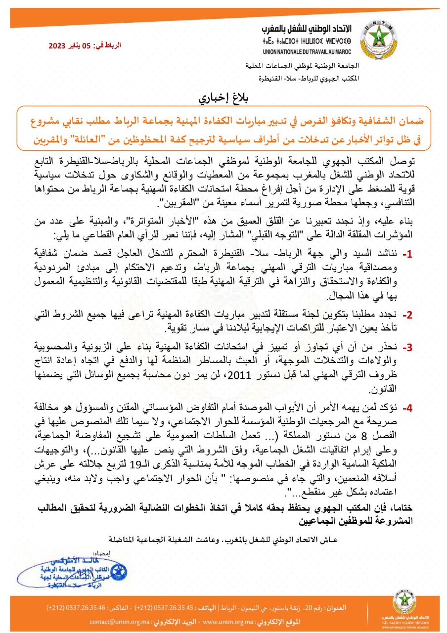 وأكد المكتب الجهوي، أنه توصل بمجموعة من المعطيات والوقائع والشكاوى حول تدخلات سياسية قوية للضغط على الإدارة من أجل إفراغ محطة امتحانات الكفاءة المهنية بجماعة الرباط من محتواها التنافسي، وجعلها محطة صورية لتمرير أسماء معينة من “المقربين”.