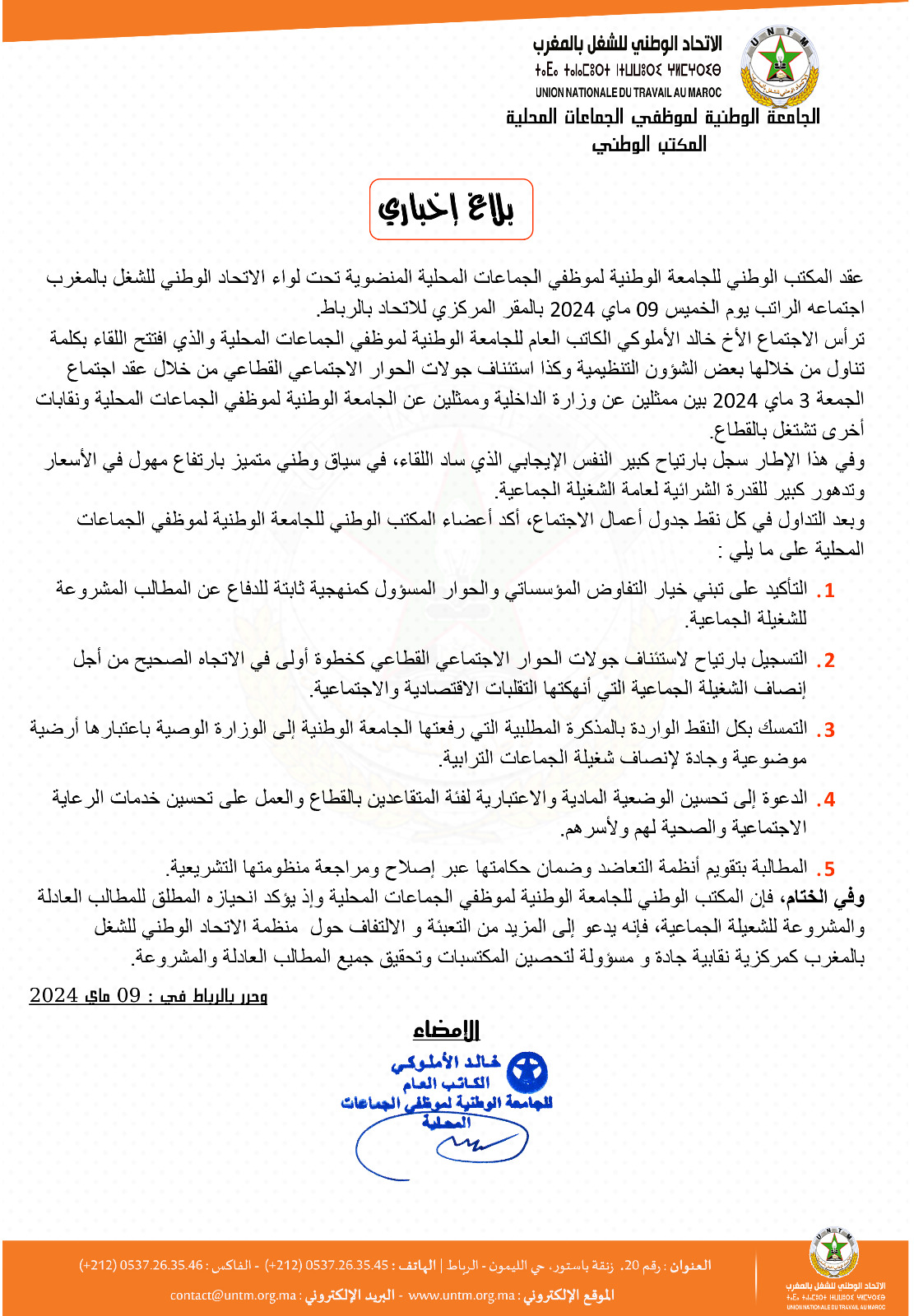 وسجلت الجامعة خلال انعقاد مكتبها الوطني الخميس 09 ماي 2024 بالمقر المركزي للاتحاد بالرباط، بارتياح لاستئناف جولات الحوار الاجتماعي القطاعي كخطوة أولى في الاتجاه الصحيح من أجل إنصاف الشغيلة الجماعية التي أنهكتها التقلبات الاقتصادية والاجتماعية.