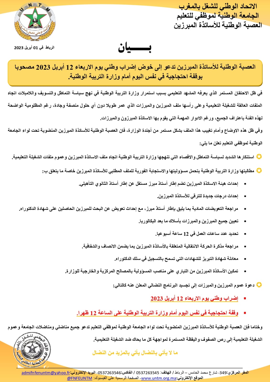 ودعت الجامعة، عموم المبرزين والمبرزات إلى تجسيد البرنامج النضالي من خلال الإضراب الوطني ليوم الاربعاء 12 أبريل 2023، والوقفة احتجاجية في نفس اليوم أمام وزارة التربية الوطنية على الساعة 12 ظهرا.