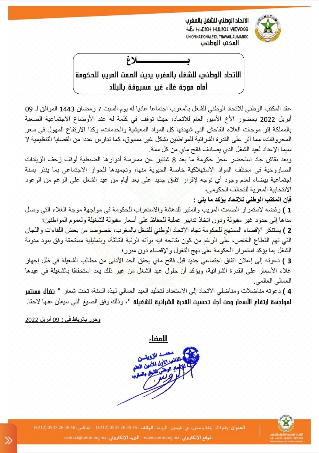 الـاتحاد الوطني للشغل بالمغرب يدين الصمت المريب للحكومة أمام موجة غلاء غير مسبوقة بالبلاد