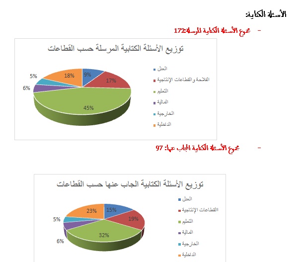 وبصم الاتحاد الوطني للشغل بالمغرب بمجلس المستشارين على حصيلة رقابية مشرفة، على المستوى الرقابيحيث احتل مرتبة متقدمة على مستوى الأسئلة الكتابية خلال الدورة التشريعية الأولى والفترة الفاصلة بين الدورتين بما يعادل 172 سؤالا كتابيا، شكلت هذه الآلية الرقابية فرصة من أجل الدفاع عن المطالب العادلة والمشروعة للطبقة الشغيلة بمختلف القطاعات الحكومية والمؤسسات العمومية والجماعات الترابية، فضلا عن كونها شكلت مناسبة لإبراز مواقف الاتحاد من عدد من الملفات التي تشغل الرأي العام الوطني.
