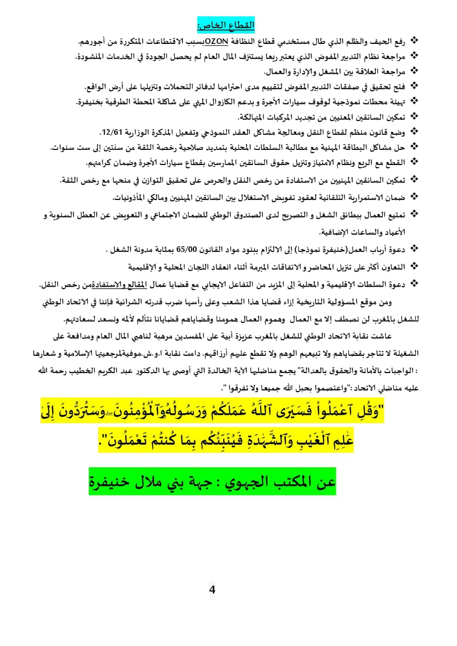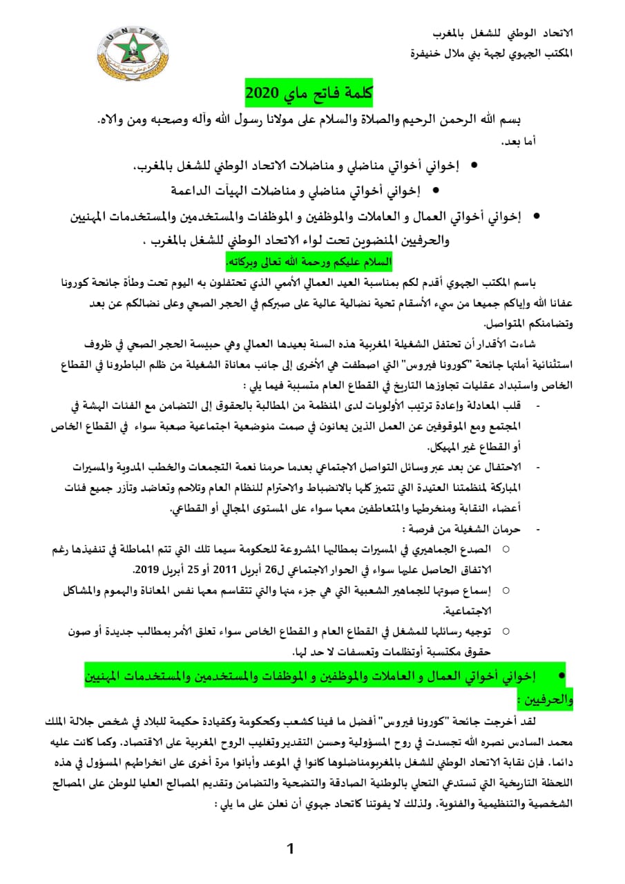 • إخواني أخواتي العمال و العاملات والموظفين و الموظفات والمستخدمين والمستخدمات المهنيين والحرفيين المنضوين تحت لواء الاتحاد الوطني للشغل بالمغرب ،
