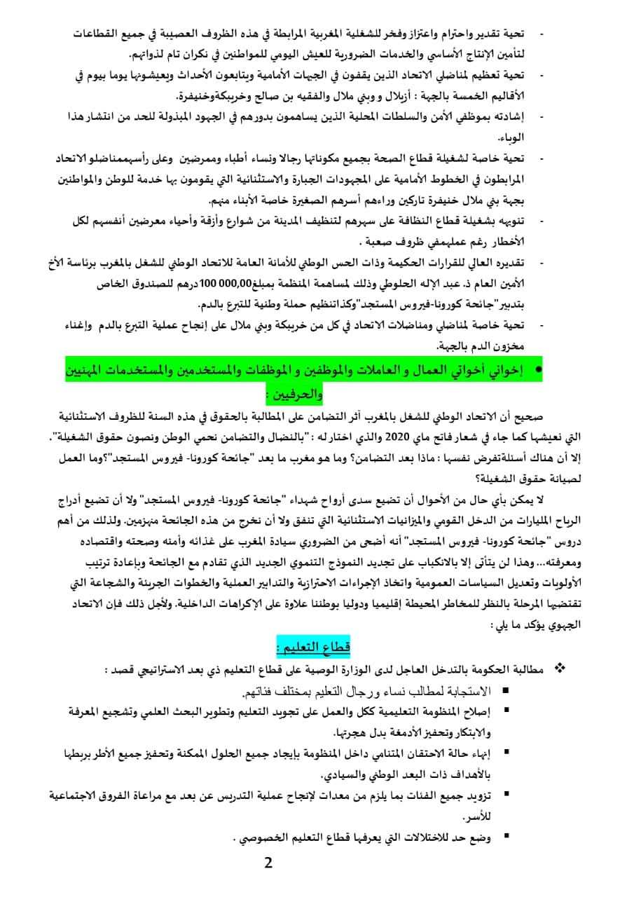 – تقديره العالي للقرارات الحكيمة وذات الحس الوطني للأمانة العامة للاتحاد الوطني للشغل بالمغرب برئاسة الأخ الأمين العام ذ. عبد الإله الحلوطي وذلك لمساهمة المنظمة بمبلغ100 000,00درهم للصندوق الخاص بتدبير”جائحة كورونا-فيروس المستجد”وكذاتنظيم حملة وطنية للتبرع بالدم.