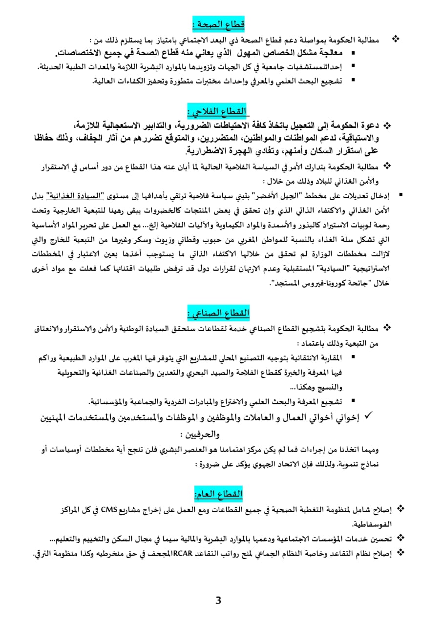 لا يمكن بأي حال من الأحوال أن تضيع سدى أرواح شهداء “جائحة كورونا- فيروس المستجد” ولا أن تضيع أدراج الرياح المليارات من الدخل القومي والميزانيات الاستثنائية التي تنفق ولا أن نخرج من هذه الجائحة منهزمين. ولذلك من أهم دروس “جائحة كورونا- فيروس المستجد” أنه أضحى من الضروري سيادة المغرب على غذائه وأمنه وصحته واقتصاده ومعرفته… وهذا لن يتأتى إلا بالانكباب على تجديد النموذج التنموي الجديد الذي تقادم مع الجائحة وبإعادة ترتيب الأولويات وتعديل السياسات العمومية واتخاذ الإجراءات الاحترازية والتدابير العملية والخطوات الجريئة والشجاعة التي تقتضيها المرحلة بالنظر للمخاطر المحيطة إقليميا ودوليا بوطننا علاوة على الإكراهات الداخلية. ولأجل ذلك فإن الاتحاد الجهوي يؤكد ما يلي :