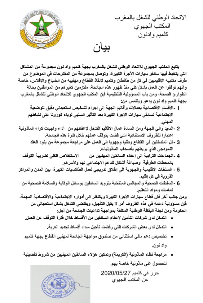 الـuntm بجهة كلميم واد نون يدعو إلى التدخل العاجل لمواجهة تداعيات جائحة الوباء على سائقي سياراة الأجرة الكبيرة