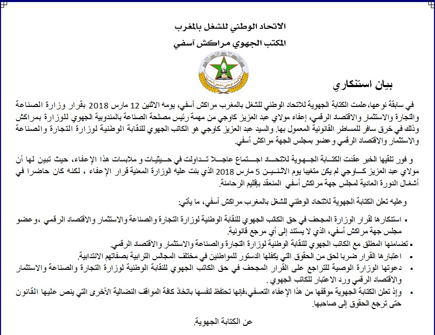 استنكرت الكتابة الجهوية للاتحاد الوطني للشغل بالمغرب مراكش آسفي، إعفاء الكاتب الجهوي للنقابة الوطنية لوزارة التجارة والصناعة والاستثمار والاقتصاد الرقمي، مولاي عبد العزيز كاوجي من مهامه بمندوبية الصناعة والتجارة بمراكش بصفته رئيس مصلحة الصناعة، بدعوى تغيبه عن العمل، محملة الوزارة تبعات قرارها الذي لا يستند إلى قانون، ومتوعدة باتخاذ كافة المواقف النضالية من أجل إرجاع الحق إلى صاحبه.