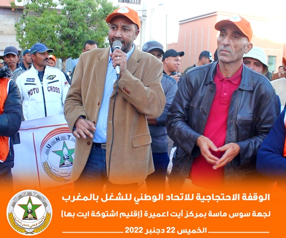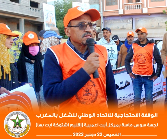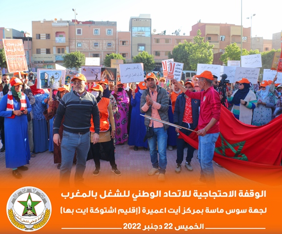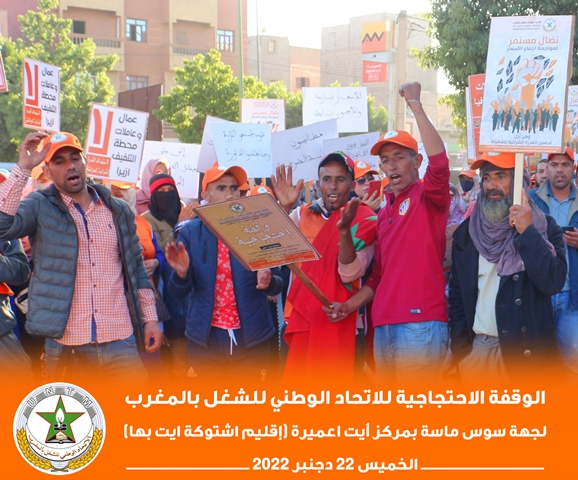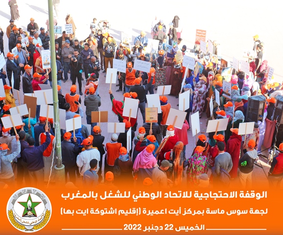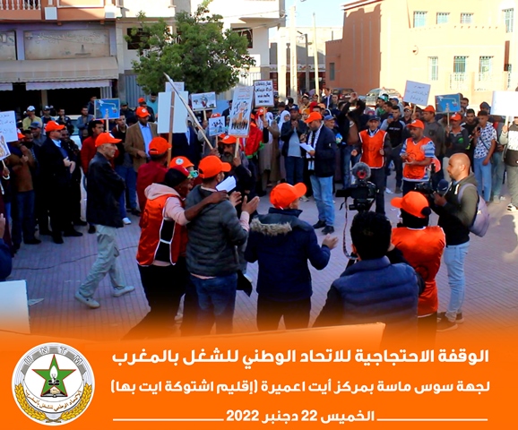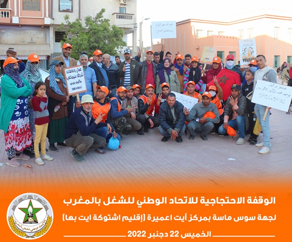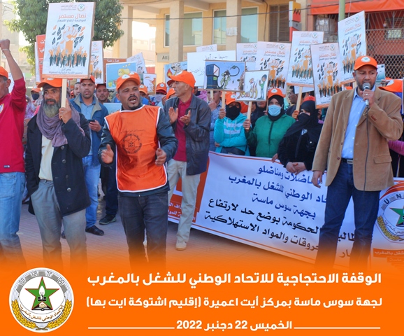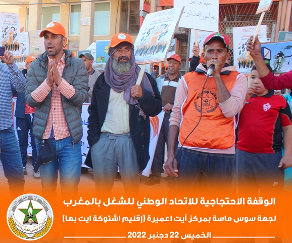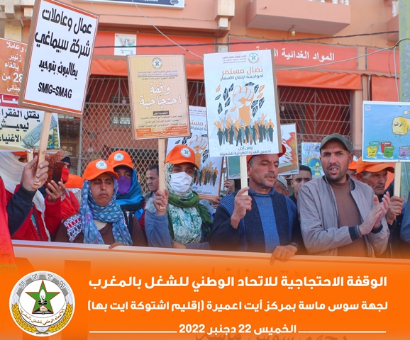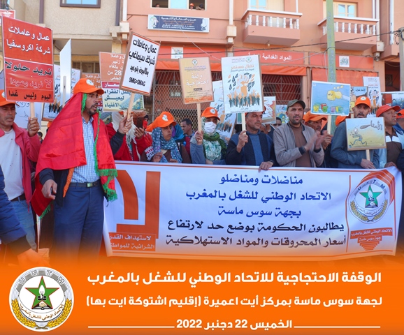 في إطار برنامجه النضالي الوطني، نظم الاتحاد الوطني للشغل بالمغرب بجهة سوس ناسة، الخميس 22 دجنبر 2022، وقفة احتجاجية بمركز أيت عميرة بإقليم اشتوكة أيت باها، احتجاجا على تجاهل الحكومة لمطالب الشغيلة، وسوء أوضاع العمال الزراعيين.