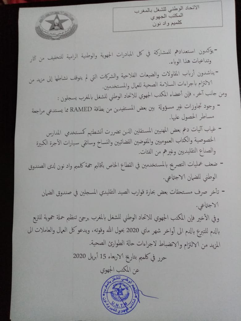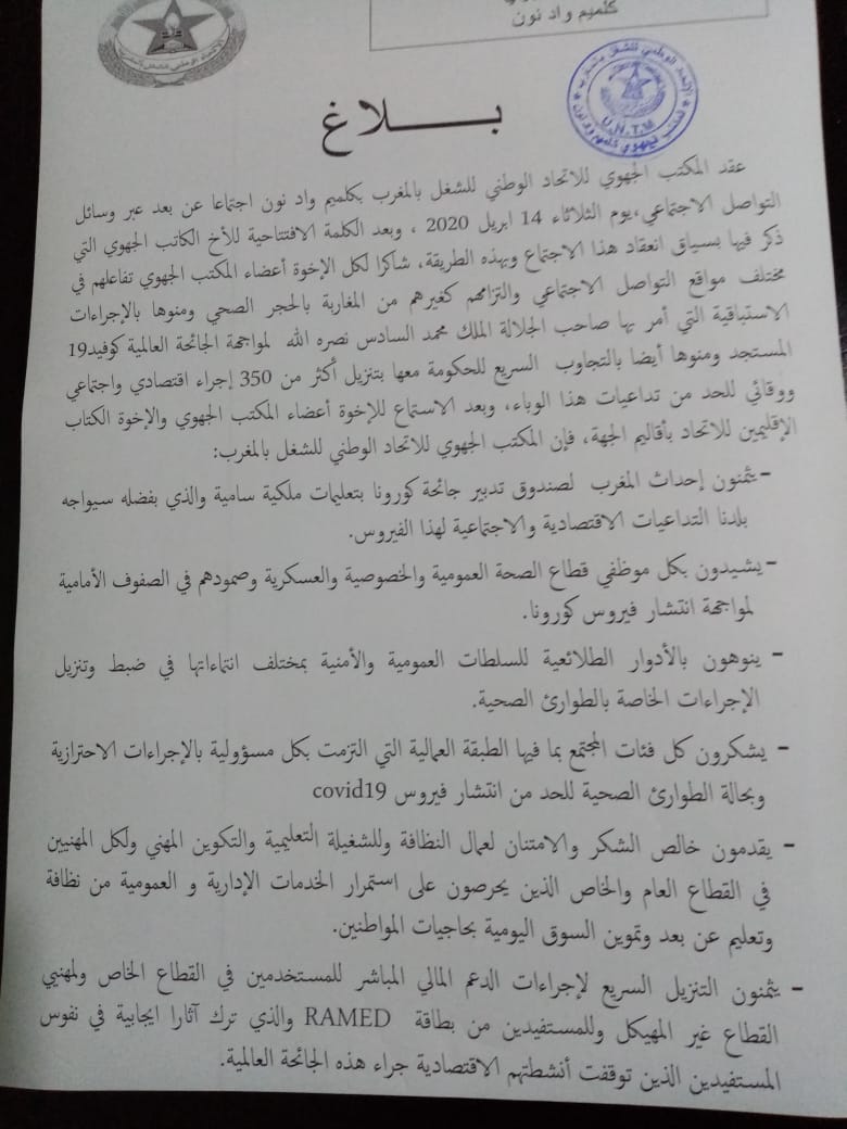 الـuntm بكلميم واد نون يثمن الأجراءات التي اتخذها المغرب لمواجهة كورونا ويؤكد استعداده المشاركة في كل المبادرات