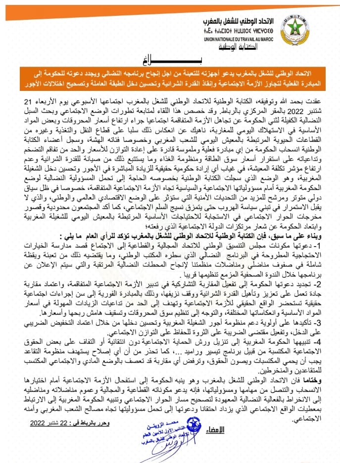 دعا الاتحاد الوطني للشغل بالمغرب، مكونات مجلس التنسيق الوطني للاتحاد المجالية والقطاعية إلى الاجتماع قصد مدارسة الخيارات الاحتجاجية المطروحة في البرنامج النضالي الذي سطره المكتب الوطني، وما يقتضيه ذلك من تعبئة ويقظة شاملة في صفوف مناضلي ومناضلات منظمتنا لإنجاح المحطات النضالية المرتقبة والتي سيتم الإعلان عن برنامجها خلال الندوة الصحفية المزمع تنظيمها قريبا.