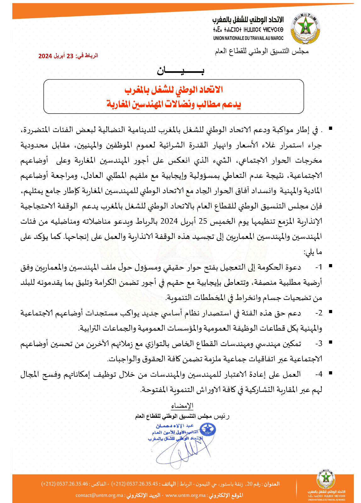 وأكد الاتحاد، في بيانه له دعم حق هذه الفئة في استصدار نظام أساسي جديد يواكب مستجدات أوضاعهم الاجتماعية والمهنية بكل قطاعات الوظيفة العمومية والمؤسسات العمومية والجماعات الترابية، لاسيما في ظل استمرار غلاء الأسعار وانهيار القدرة الشرائية، مقابل محدودية مخرجات الحوار الاجتماعي، الشيء الذي انعكس على أجور المهندسين المغاربة وعلى أوضاعهم الاجتماعية، نتيجة عدم التعاطي بمسؤولية وإيجابية مع ملفهم المطلبي العادل.