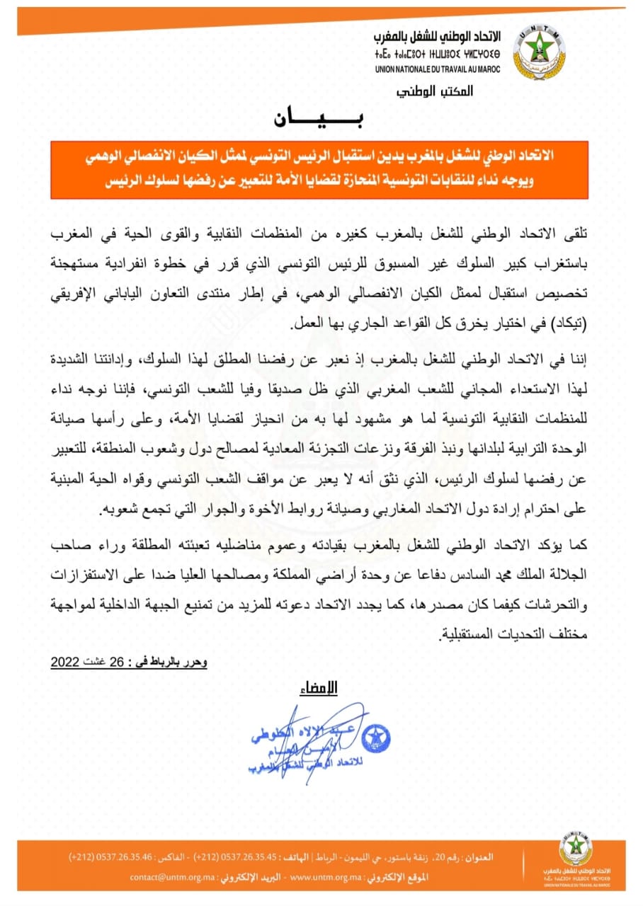 عبر الاتحاد الوطني للشغل بالمغرب، عن إدانته لاستقبال الرئيس التونسي لممثل الكيان الانفصالي الوهمي، ووجه نداء للنقابات التونسية المنحازة لقضايا الأمة للتعبير عن رفضها لسلوك الرئيس.