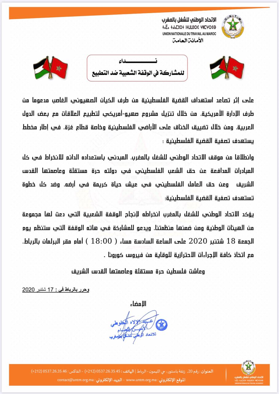 أكد الاتحاد الوطني للشغل بالمغرب انخراطه لإنجاح الوقفة الشعبية التي دعت لها مجموعة من الهيئات الوطنية ومن ضمنها منظمة الاتحاد ، وذلك على إثر تصاعد استهداف القضية الفلسطينية من طرف الكيان الصهيوني الغاصب مدعوما من طرف الإدارة الأمريكية، من خلال تنزيل مشروع صهيو-أمريكي لتطبيع العلاقات مع بعض الدول العربية، ومن خلال تضييق الخناق على الأراضي الفلسطينية وخاصة قطاع غزة، في إطار مخطط يستهدف تصفية القضية الفلسطينية.