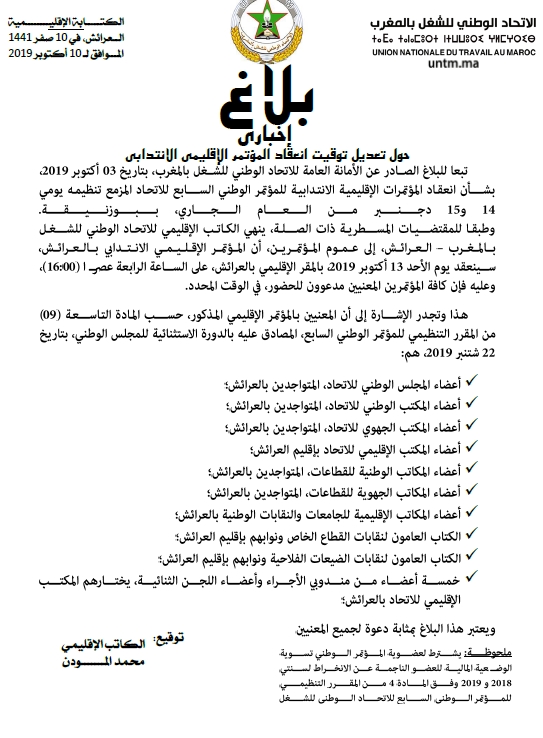 تبعا للبلاغ الصادر عن الأمانة العامة للاتحاد الوطني للشغل بالمغرب، بتاريخ 03 أكتوبر 2015 بشأن انعقاد المؤتمرات الإقليمية الانتدابية للمؤتمر الوطني السابع للاتحاد المزمع تنظيمه يومي 14 و15 دجنبر من العام الجاري، بيوزنيقة وطبقا للمقتضيات المسطرية ذات الصلة، أعلن الكاتب الإقليمي للاتحاد بالعرائش، أن المؤتمر الإقليمي الانتدابي سينعقد يوم الأحد 13 أكتوبر 2015، بالمقر الإقليمي بالعرائش، على الساعة الرابعة.