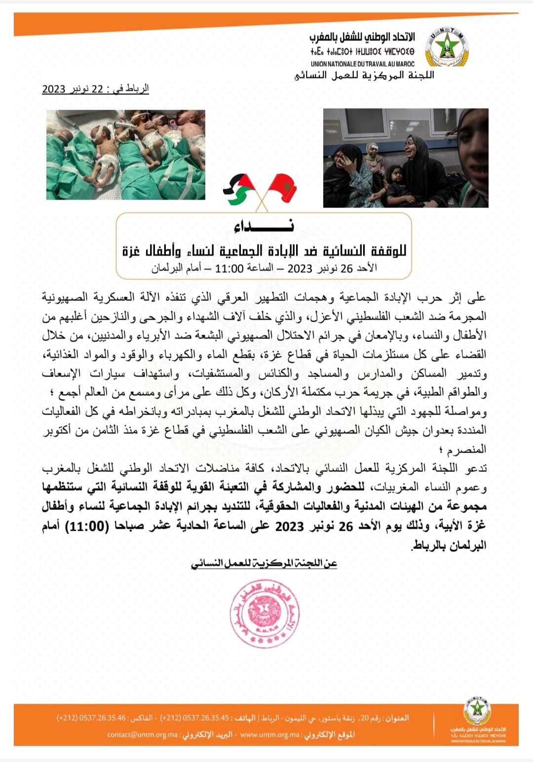 دعت اللجنة المركزية للعمل النسائي بالاتحاد الوطني للشغل بالمغرب، كافة مناضلات الاتحاد وعموم النساء المغربيات، للحضور والمشاركة في التعبئة القوية للوقفة النسائية التي ستنظمها مجموعة من الهيئات المدنية والفعاليات الحقوقية، للتنديد بجرائم الإبادة الجماعية لنساء وأطفال غزة الأبية، وذلك يوم الأحد 26 نونبر 2023 على الساعة الحادية عشر صباحا (11:00) أمام البرلمان بالرباط.