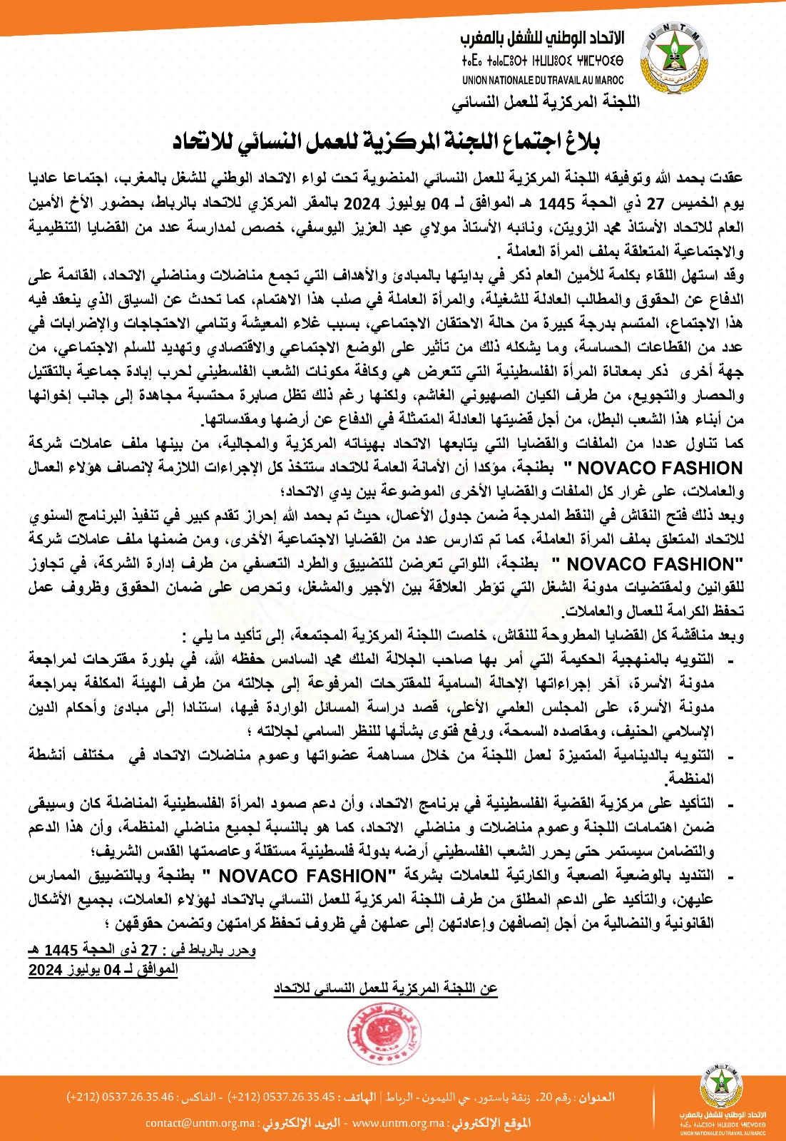 ونددت اللجنة، بالوضعية الصعبة والكارتية للعاملات بشركة “NOVACO FASHION ” بطنجة وبالتضييق الممارس عليهن، مؤكدة على الدعم المطلق من طرف اللجنة المركزية للعمل النسائي بالاتحاد لهؤلاء العاملات، بجميع الأشكال القانونية والنضالية من أجل إنصافهن وإعادتهن إلى عملهن في ظروف تحفظ كرامتهن وتضمن حقوقهن.