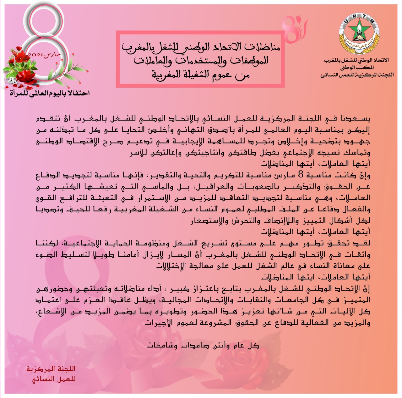 هنأت اللجنة المركزية للعمل النسائي بالإتحاد الوطني للشغل بالمغرب، النساء بمناسبة اليوم العالمي للمرأة، وتقدمت بأصدق التهاني وأخلص التحايا على كل ما تبذلنه من جهود بتضحية وإخلاص وتجرد للمساهمة الإيجابية في تدعيم صرح الاقتصاد الوطني وتماسك نسيجه الاجتماعي بفضل طاقتهن وإنتاجيتهن  وإعالتهن للأسر.