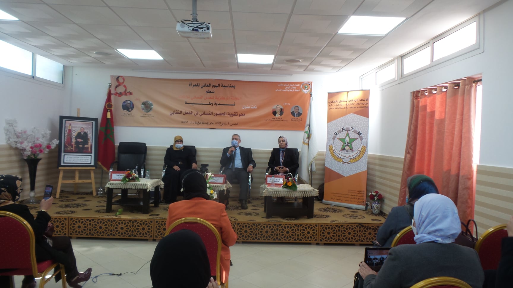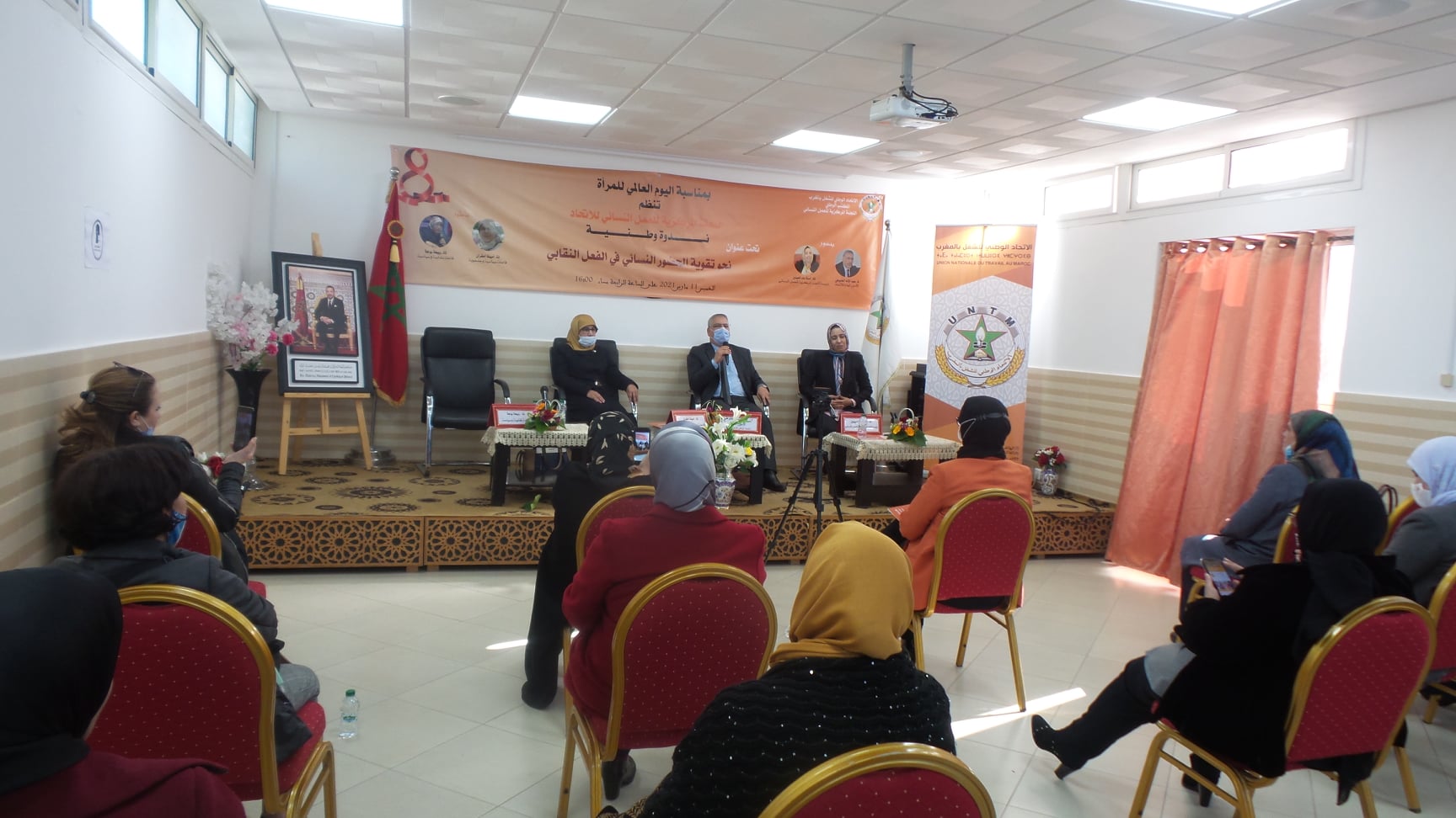 بمناسبة اليوم العالمي للمرأة الذي يصادف 8 مارس من كل سنة، نظمت اللجنة المركزية للعمل النسائي للاتحاد الوطني للشغل بالمغرب، الخميس 11 مارس 2021، ندوة وطنية حضورية وعن بعد تحت عنوان ” نحو تقوية الحضور النسائي في الفعل النقابي”.