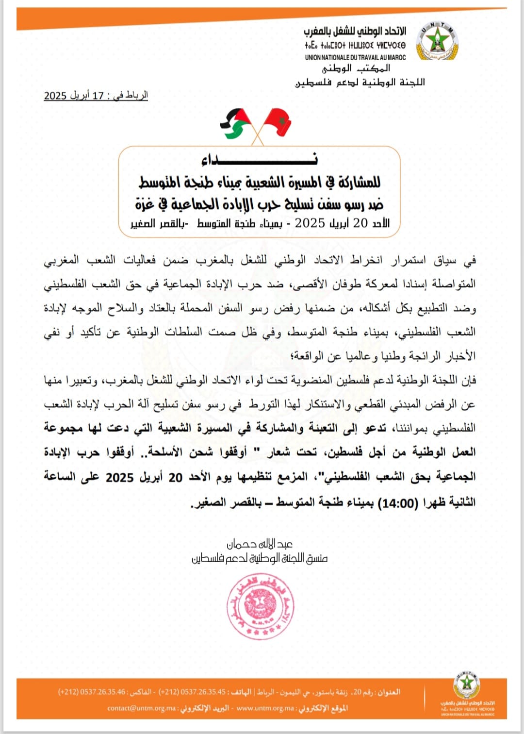 تعبيرا منها عن الرفض المبدئي القطعي والاستنكار لرسو سفن تسليح آلة الحرب لإبادة الشعب الفلسطيني بموانئنا، دعت اللجنة الوطنية لدعم فلسطين المنضوية تحت لواء الاتحاد الوطني للشغل بالمغرب، إلى التعبئة والمشاركة في المسيرة الشعبية التي دعت لها مجموعة العمل الوطنية من أجل فلسطين، تحت شعار ” أوقفوا شحن الأسلحة.. أوقفوا حرب الإبادة الجماعية بحق الشعب الفلسطيني”، المزمع تنظيمها يوم الأحد 20 أبريل 2025 على الساعة الثانية ظهرا (14:00) بميناء طنجة المتوسط – بالقصر الصغير.