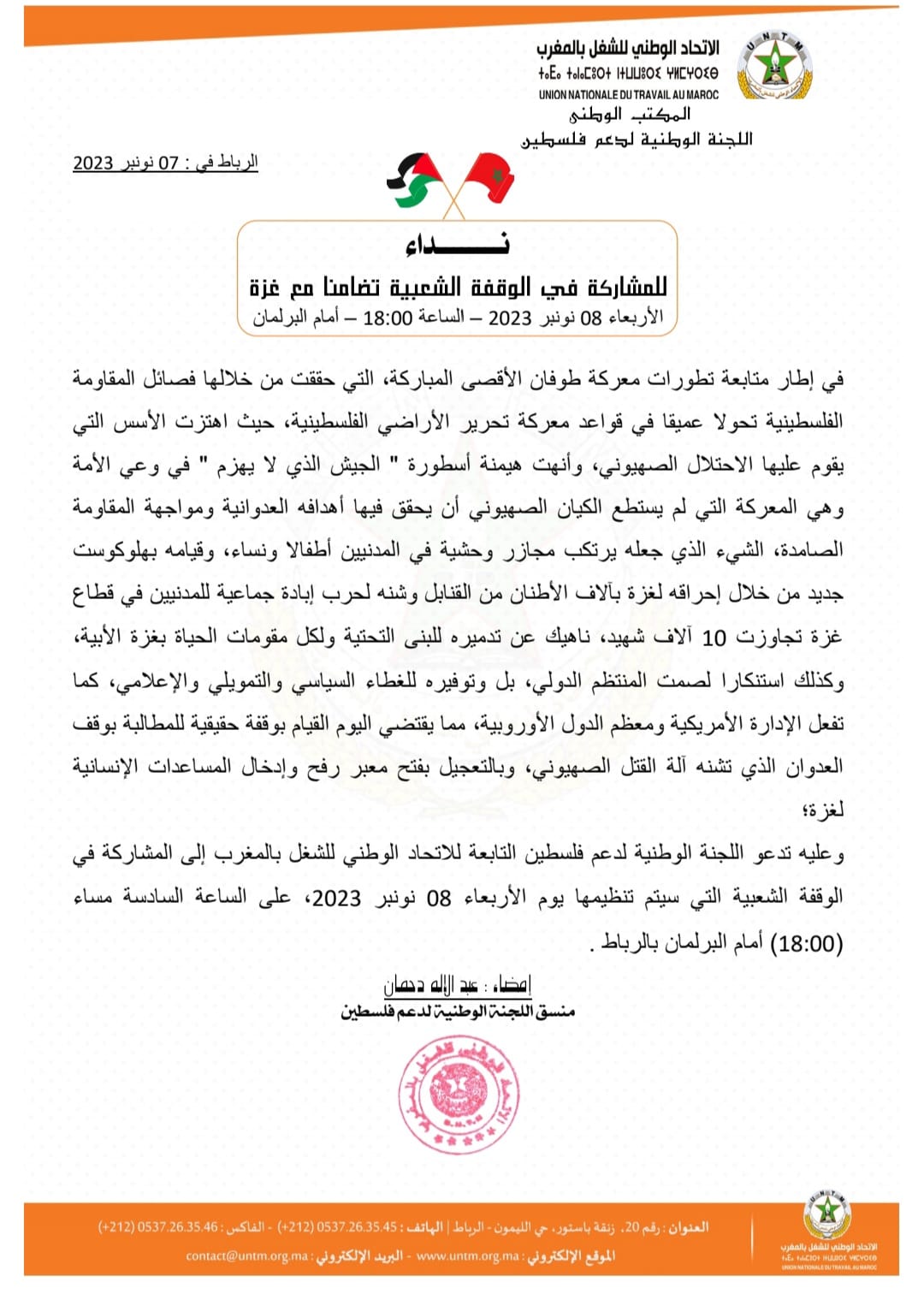 دعت اللجنة الوطنية لدعم فلسطين التابعة للاتحاد الوطني للشغل بالمغرب إلى المشاركة في الوقفة الشعبية يوم الأربعاء 08 نونبر 2023، على الساعة السادسة مساء (18:00) أمام البرلمان بالرباط، احتجاجا على المجازر الوحشية للاحتلال الصهيوني في حق المدنيين أطفالا ونساء، وقيامه بهلوكوست جديد من خلال إحراقه لغزة بآلاف الأطنان من القنابل وشنه لحرب إبادة جماعية للمدنيين في قطاع غزة تجاوزت 10 آلاف شهید.