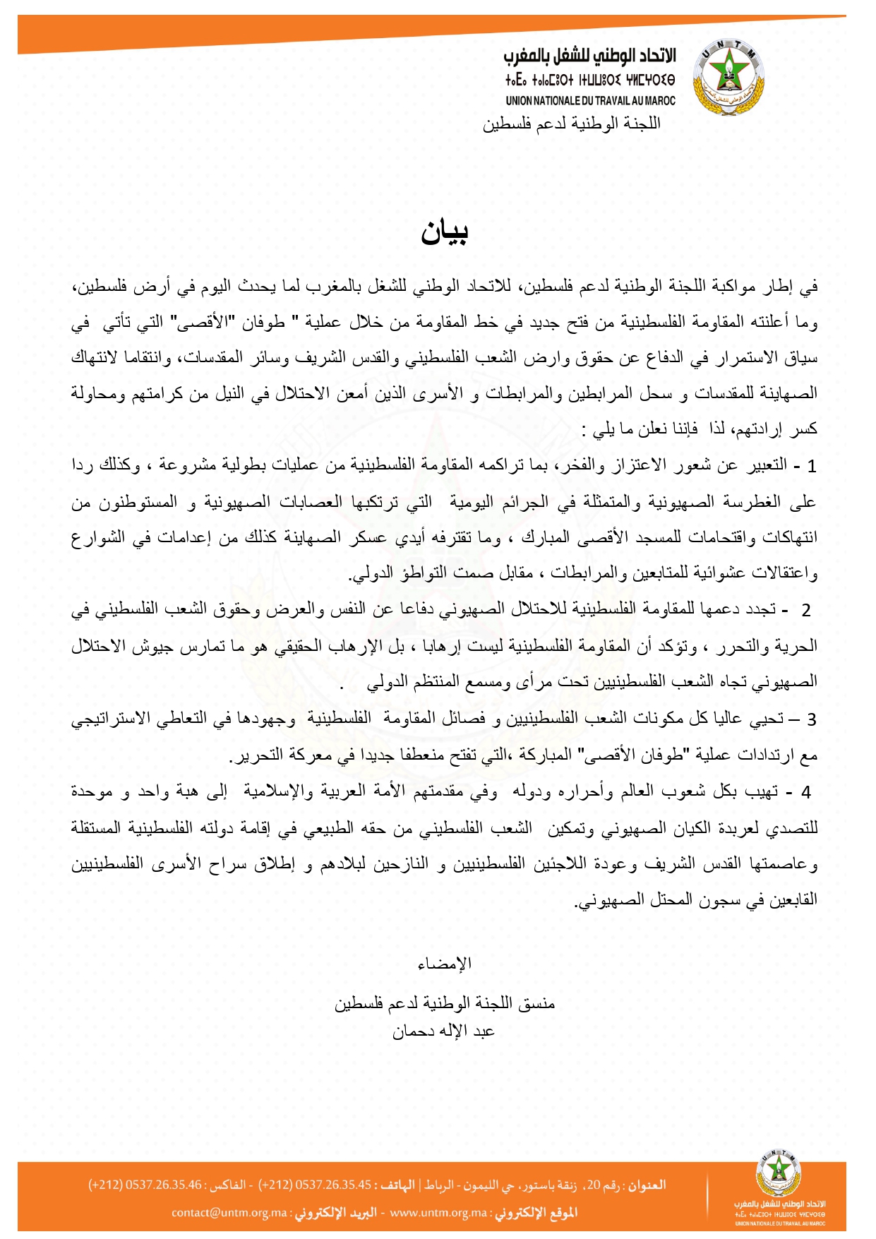 عبرت اللجنة الوطنية لدعم فلسطين، التابعة للاتحاد الوطني للشغل بالمغرب، عن الشعور بالاعتزاز والفخر، بما تراكمه المقاومة الفلسطينية من عمليات بطولية مشروعة ، وكذلك ردا على الغطرسة الصهيونية والمتمثلة في الجرائم اليومية التي ترتكبها العصابات الصهيونية و المستوطنون من انتهاكات واقتحامات للمسجد الأقصى المبارك ، وما تقترفه أيدي عسكر الصهاينة كذلك من إعدامات في الشوارع واعتقالات عشوائية للمتابعين والمرابطات ، مقابل صمت التواطؤ الدولي.