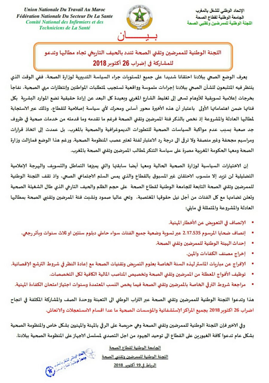 ودعت اللجنة الوطنية للممرضين وتقني الصحة الى التعبئة ووحدة الصف عبر التراب الوطني للمشاركة المكثفة في انجاح اضراب 26 اكتوبر 2018 بجميع المراكز الإستشفائية والمؤسسات الصحية ما عدا أقسام المستعجلات والإنعاش.