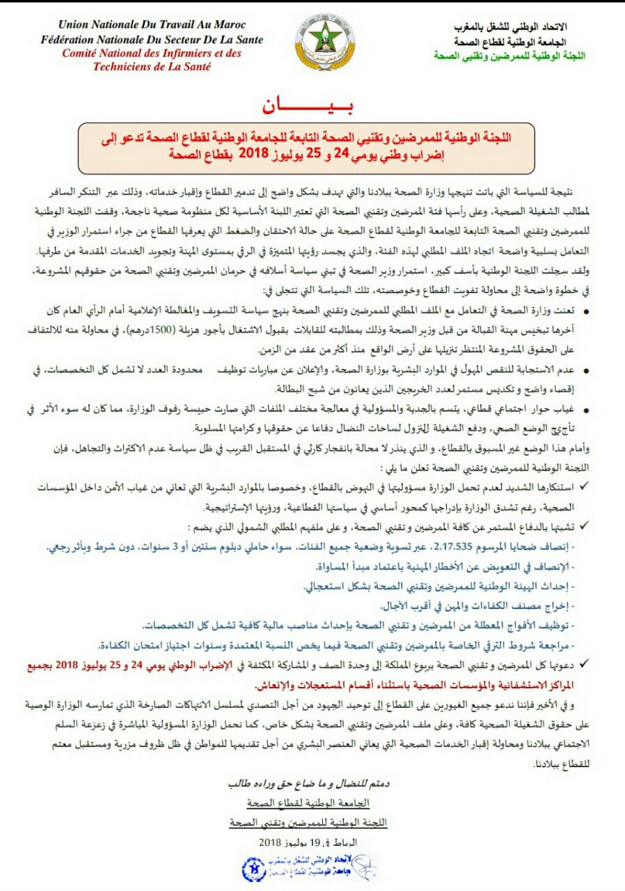 دعت اللجنة الوطنية للممرضين وتقنيي الصحة بالجامعة الوطنية لقطاع الصحة المنضوية تحت لواء الاتحاد الوطني للشغل بالمغرب، كل الممرضين و تقنيي الصحة بربوع المملكة إلى وحدة الصف و المشاركة المكثفة في الإضراب الوطني يومي 24 و 25 يوليوز 2018 بجميع المراكز الاستشفائية والمؤسسات الصحية باستثناء أقسام المستعجلات والإنعاش، احتجاجا على حالة الاحتقان والضغط التي يعرفها القطاع من جراء استمرار الوزير في التعامل بسلبية واضحة اتجاه الملف المطلبي لهذه الفئة.