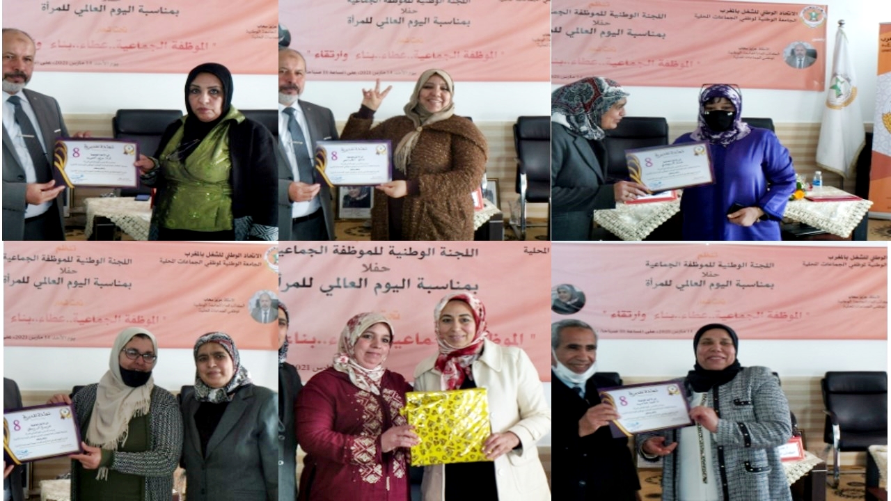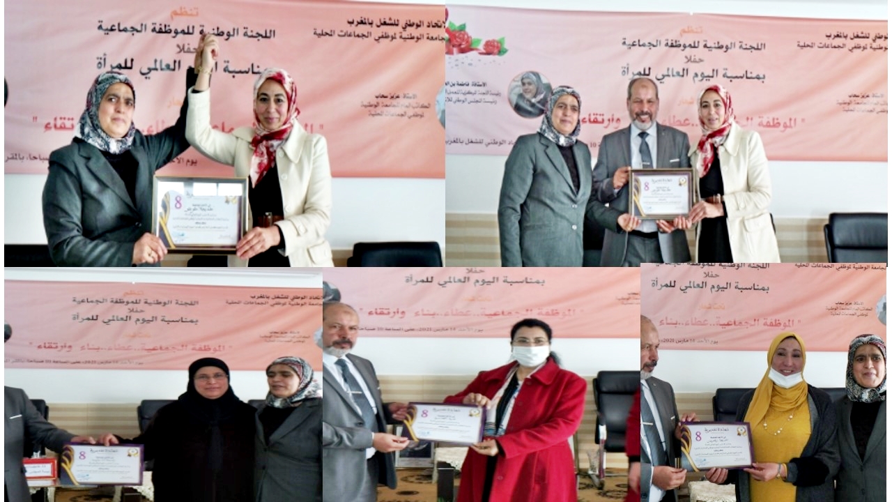 تحت شعار ” الموظفة الجماعية عطاء..بناء..وارتقاء ..” نظمت اللجنة الوطنية للموظفة الجماعية للجامعة الوطنية لموظفي الجماعات المحلية، حفلا بمناسبة اليوم العالمي للمرأة، السبت 14مارس 2021 بالمقر المركزي بالرباط حضوري وعن بعد .