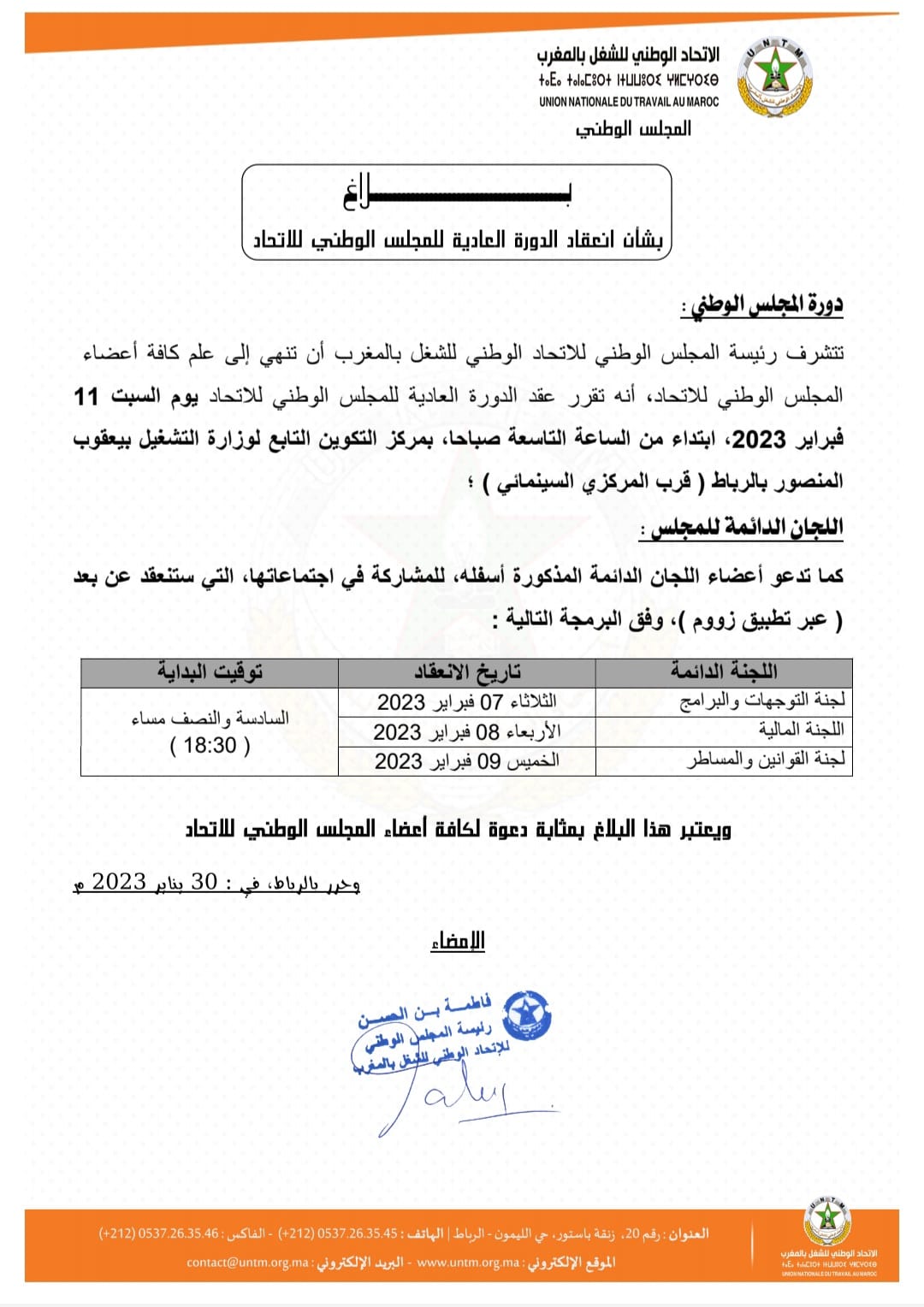 يعقد المجلس الوطني للاتحاد الوطني للشغل بالمغرب يوم السبت 11 فبراير 2023، دورته العادية ابتداء من الساعة التاسعة صباحا، بمركز التكوين التابع لوزارة التشغيل بيعقوب المنصور بالرباط ( قرب المركزي السينمائي).