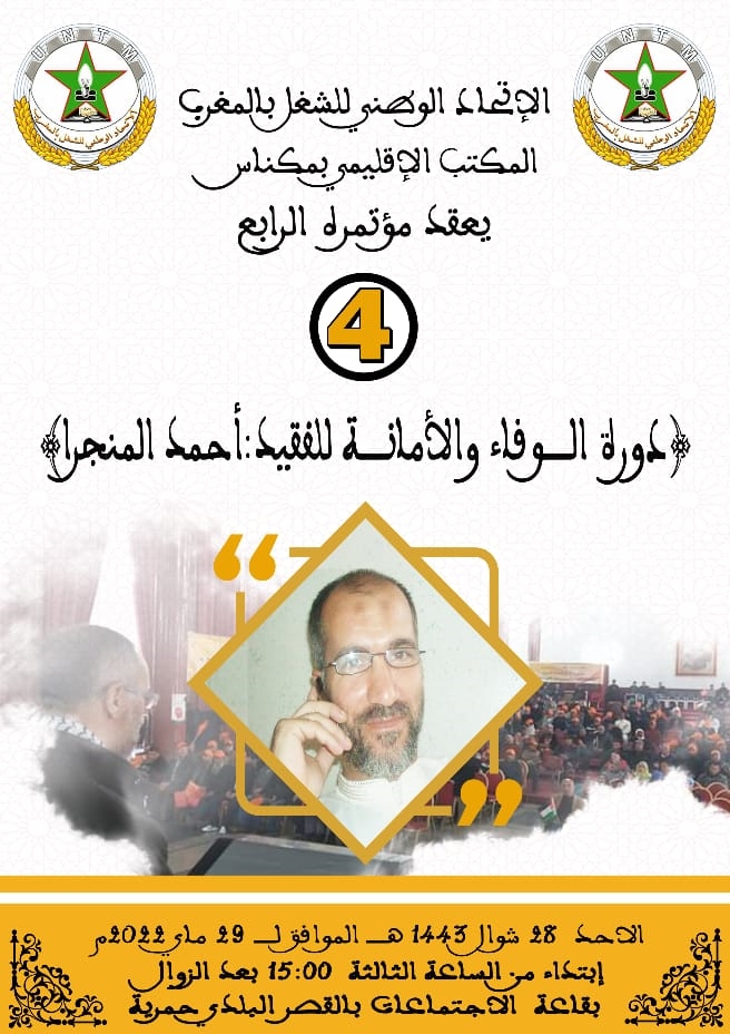 بعد المؤتمر الجهوي الخامس للاتحاد الوطني للشغل لجهة فاس مكناس، وفي إطار تجديد هياكله الإقليمية، يعقد المكتب الإقليمي للاتحاد بمكناس، الأحد 29 ماي 2022، بقاعة الاجتماعات بالقصر البلدي بالحمرية، مؤتمره الرابع، تحت شعار ” دورة الوفاء والأمانة للفقيد : أحمد المنجرا”.