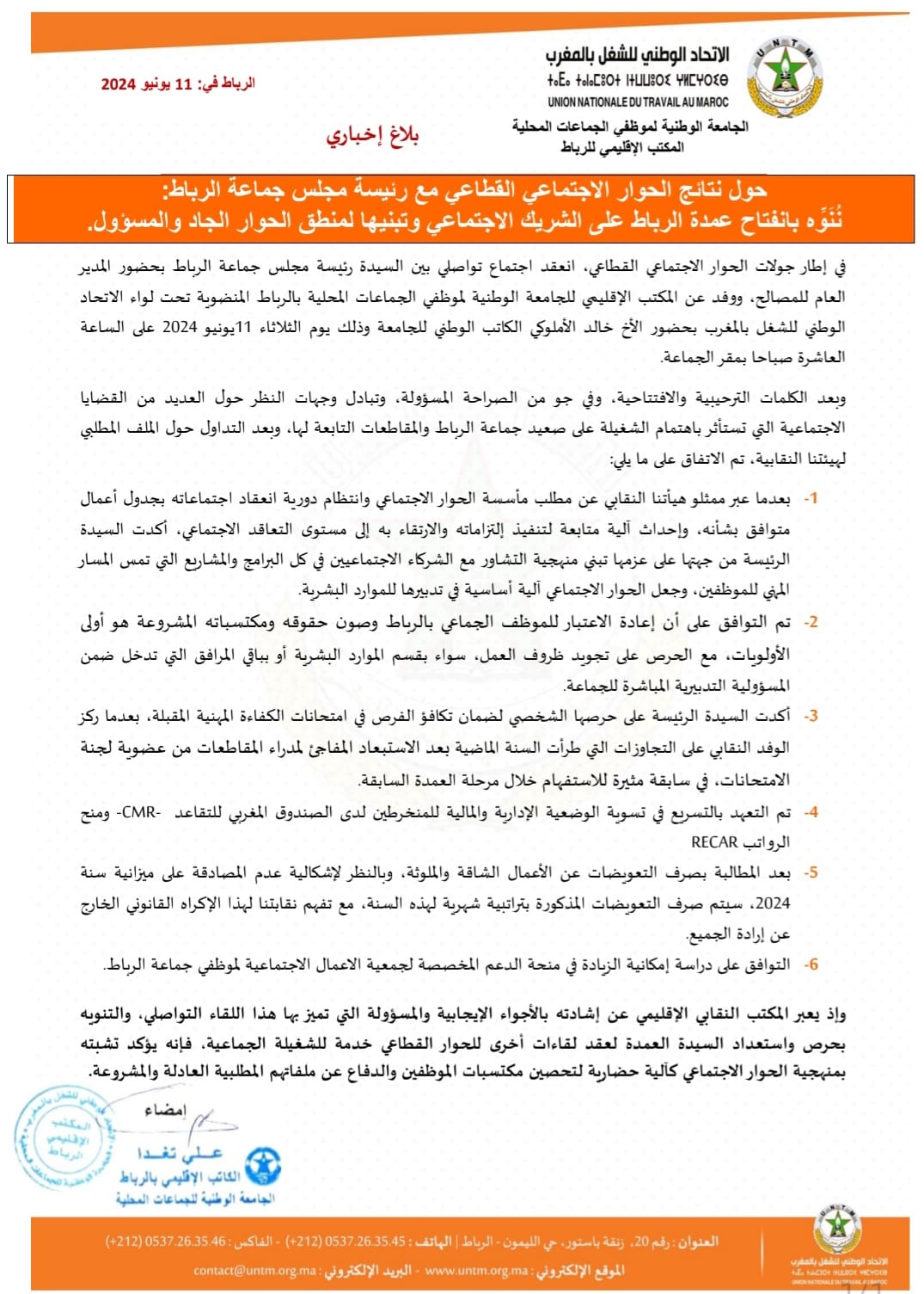 وأشار المكتب في بيان له، أنه تم التوافق على أن إعادة الاعتبار للموظف الجماعي بالرباط وصون حقوقه ومكتسباته المشروعة هو أولى الأولويات، مع الحرص على تجويد ظروف العمل، سواء بقسم الموارد البشرية أو بباقي المرافق التي تدخل ضمن المسؤولية التدبيرية المباشرة للجماعة.