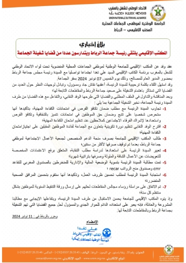 وأكد المكتب الإقليمي، أن الرئيسة تجاوبت خلال اللقاء، مع مطلب ضمان تكافؤ الفرص في امتحانات الكفاءة المهنية، بتأكيدها أنها ستحرص شخصيا على تتبع وضمان حق الموظفين في امتحانات تتميز بالشفافية وتكافؤ الفرص واستعدادها لإشراك الفرقاء الاجتماعين كملاحظين عند تنظيم امتحان الكفاءة المهنية.