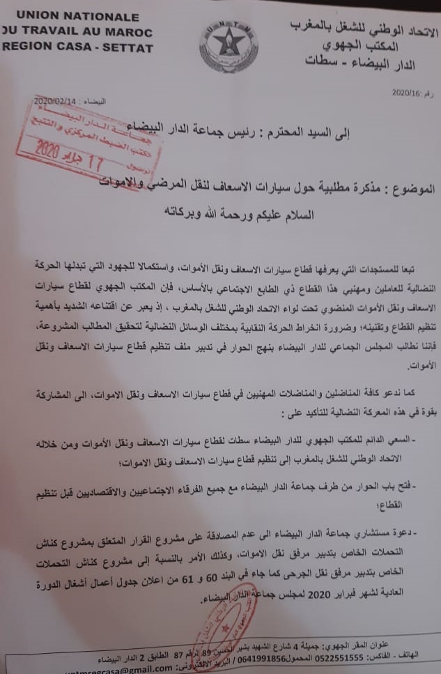 بعد المراسلة التي توجهت بها الكتابة الجهوية للاتحاد الوطني للشغل بالمغرب بجهة الدار البيضاء سطات إلى جماعة الدار البيضاء بخصوص المشاكل التي يعاني منها مهنيي سيارات الإسعاف ونقل الأموات، عُقد الإثنين 17 فبراير 2020 بمقر الجماعة لقاء حضره الكاتب الجهوي عبد الكريم البريكي مرفوقا بأعضاء من المكتب الجهوي لمهنيي القطاع، وحضره عن الجماعة نائبا العمدة ومدير المصالح ورؤساء الأقسام.