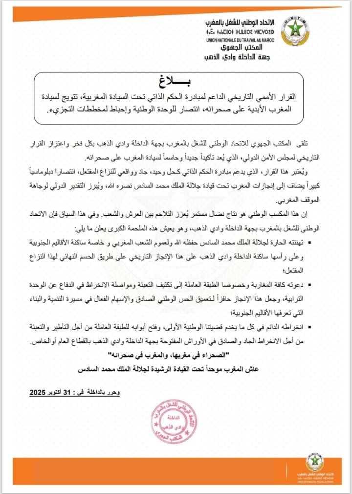 بيان المكتب الجهوي للاتحاد الوطني للشغل بالمغرب بجهة الداخلة وادي الذهب، بخصوص القرار الأممي التاريخي الداعم لمبادرة الحكم الذاتي تحت السيادة المغربية.