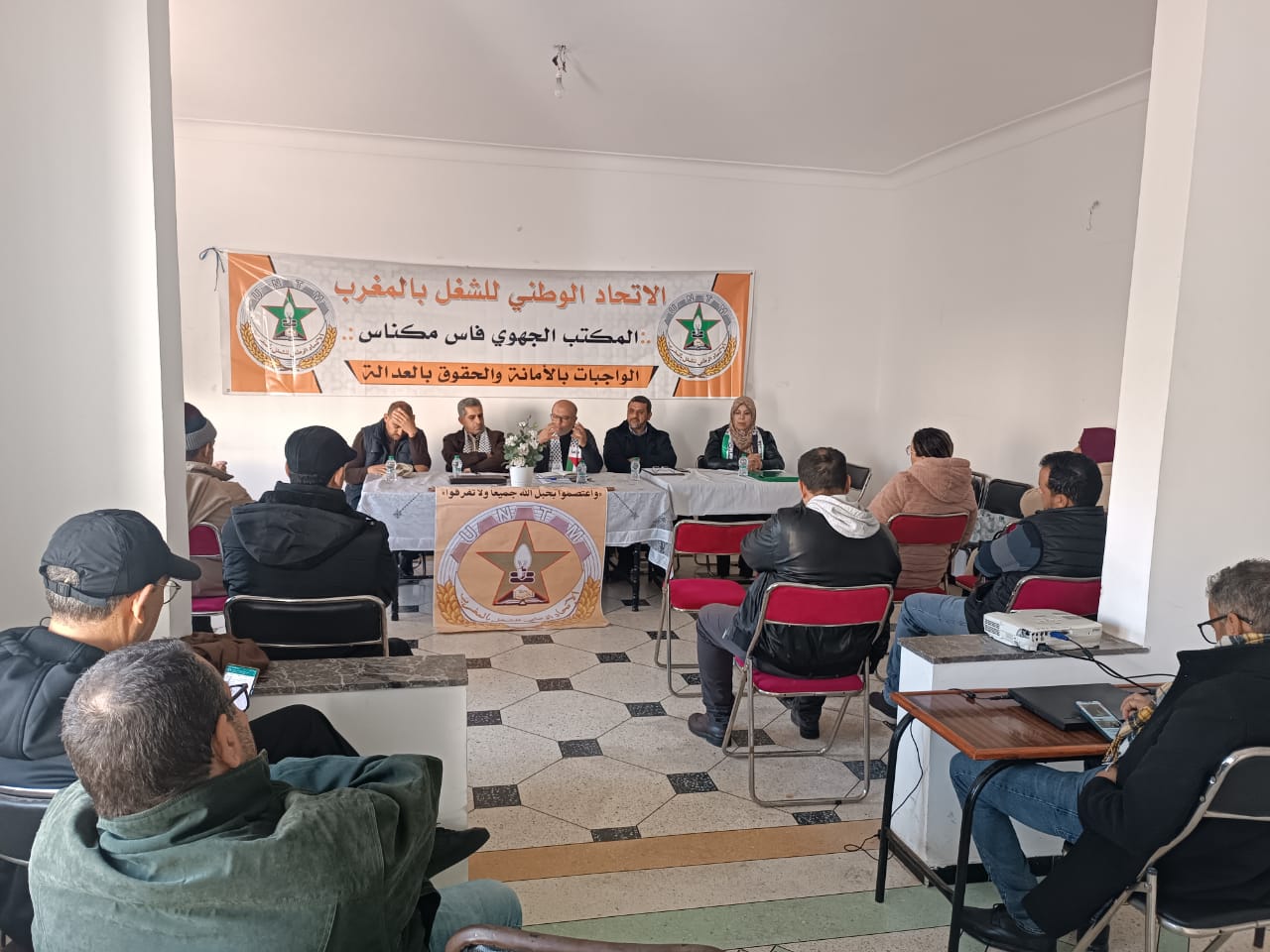 في إطار تنزيل البرنامج السنوي للاتحاد الوطني للشغل بالمغرب، كما صادق عليه المجلس الوطني للاتحاد بتاريخ 28 يناير 2024، خاصة ما يتعلق ببتبع انعقاد الهيئات القطاعية والمجالية مساهمة في رفع جاهزيتها، عقد المكتب الجهوي للاتحاد بجهة فاس مكناس، الأحد 25 فبراير 2024، مجلس التنسيق الجهوي بالجهة بشعار “العمل النقابي الجاد أساس ضمان حقوق الشغيلة”، تحت إشراف الدكتور رضى شروف نائب الامين العام، والاستاذ حسن مستظرف عضو المكتب الوطني للاتحاد.