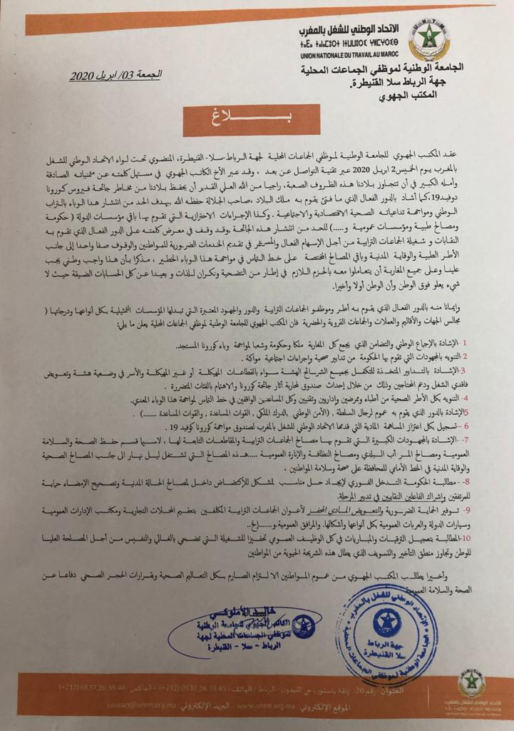 انعقد الخميس 2 ابريل 2020 ، المكتب الجهوي للجامعة الوطنية لموظفي الجماعات المحلية لجهة الرباط -سلا- القنيطرة المنضوية تحت لواء الاتحاد الوطني للشغل بالمغرب عبر تقنيات التواصل عن بعد.