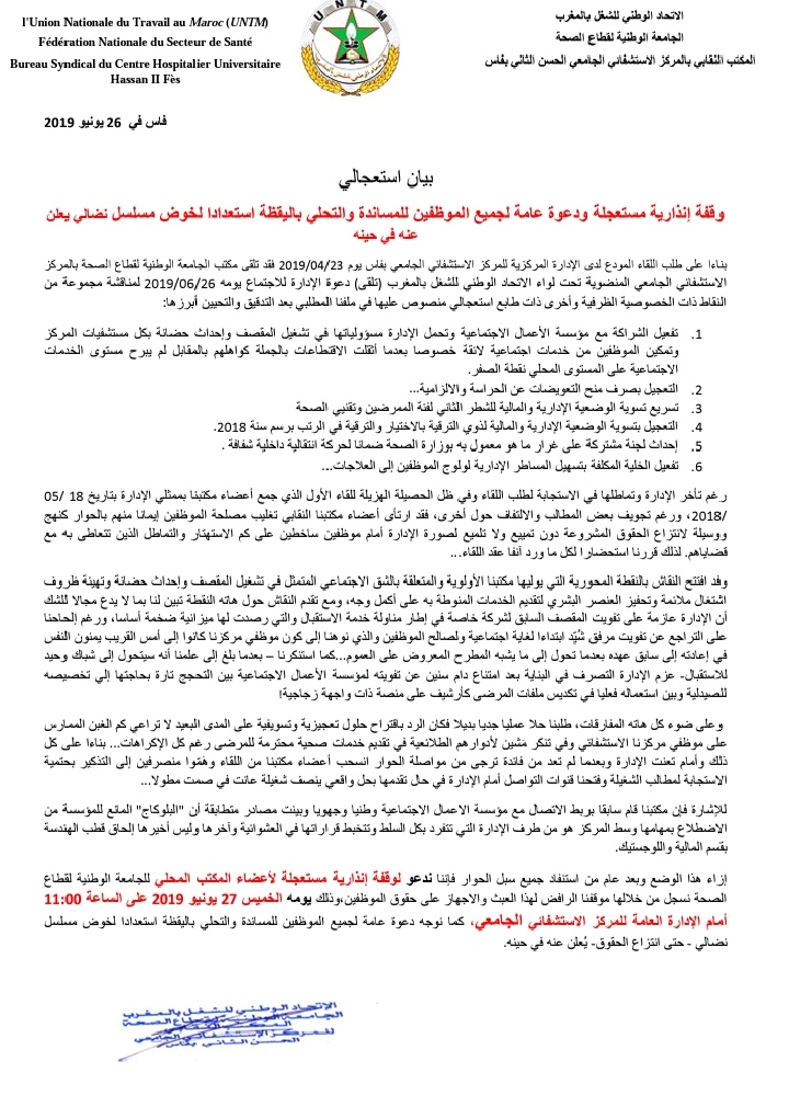 نظم المكتب النقابي بالمركز الاستشفائي الجامعي الحسن الثاني التاربع للجامعة الوطنية لقطاع الصحة المنضوية تحت لواء الاتحاد الوطني للشغل بالمغرب، الخميس 27 يونيو 2019 وقفة احتجاجية إنذاريه أمام الإدارة العامة للمركز الاستشفائي الجامعي بفاس، احتجاجا على تماطل الإدارة في الاستجابة للمطالب المشروعة والعادلة للشيغلة، وذلك بعد استنفاد جميع سبل الحوار والتي كان آخرها لقاء الأربعاء 26 يونيو 2019.