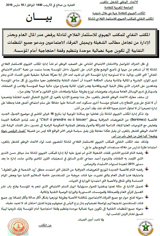 أكد المكتب النقابي للمكتب الجهوي للاستثمار الفلاحي لتادلة التابع للجامعة المغربية للفلاحة المنضوية تحت لواء الاتحاد الوطني للشغل بالمغرب، على رفضه لهدر المال العام، محذرا الإدارة من تجاهل مطالب الشغيلة وتهميش الفرقاء الاجتماعيين، وداعيا جميع المنظمات النقابية إلى تكوين جبهة نضالية موحدة وتنظيم وقفة احتجاجية أمام المؤسسة.