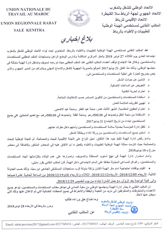 قرر المكتب النقابي لمستخدمي الهيئة الوطنية للطبيبات والأطباء بالرباط، المنضوي تحت لواء الاتحاد الوطني للشغل بالمغرب تنظيم مجموعة من الوقفات الاحتجاجية شهر دجنبر المقبل أمام مقر الهيئة الكائن بزنقة متوكة قرب مستعجلات المستشفى الجامعي ابن سينا، احتجاجا على تماطل الإدارة في الاستجابة للملف المطلبي للمستخدمات والمستخدمين، وذلك منذ ، وذلك منذ اتفاق 21 يونيو2017 الموقع بالمديرية الجهوية للشغل والإدماج المهني وبإشراف من المدير الجهوي.