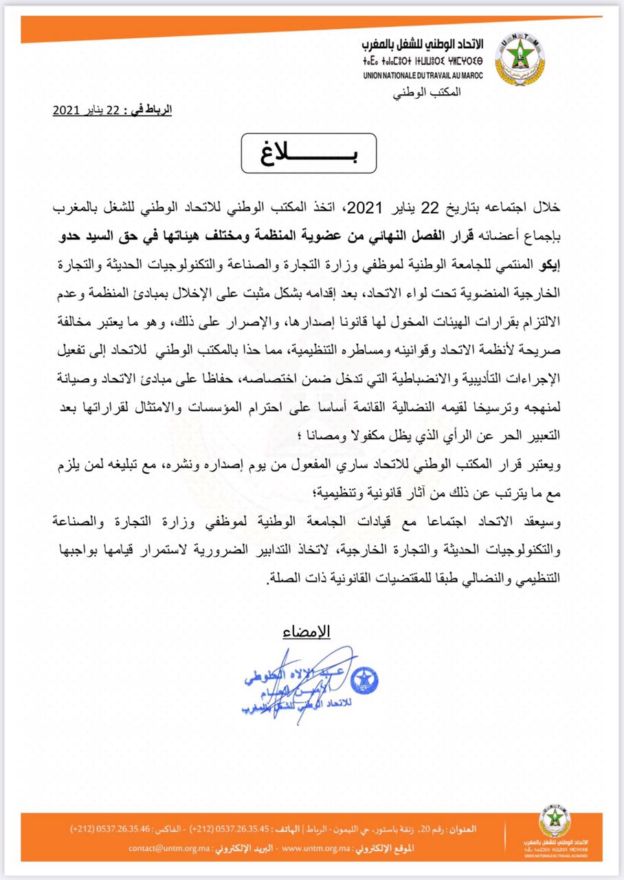 اتخذ المكتب الوطني للاتحاد الوطني للشغل بالمغرب بإجماع أعضائه، خلال خلال اجتماعه بتاريخ 22 يناير 2021، قرار الفصل النهائي من عضوية المنظمة ومختلف هيئاتها في حق السيد حدو إيكو المنتمي للجامعة الوطنية لموظفي وزارة التجارة والصناعة والتكنولوجيات الحديثة والتجارة الخارجية المنضوية تحت لواء الاتحاد.