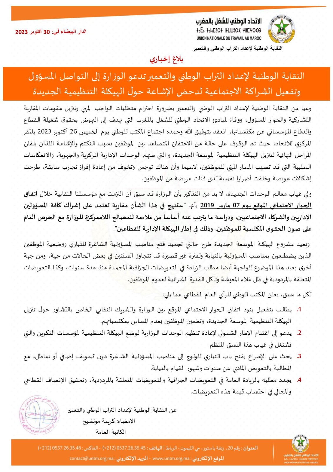 1. يطالب بتفعيل بنود اتفاق الحوار الاجتماعي الموقع بين الوزارة والشريك النقابي الخاص بالتشاور حول تنزيل الهيكلة التنظيمية الموسعة الجديدة، وتطمين الموظفين بعدم المساس بمكتسباتهم.