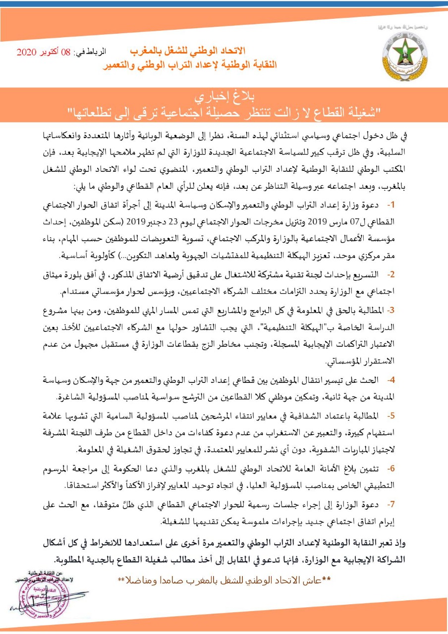 دعت النقابة الوطنية لإعداد التراب الوطني والتعمير، المنضوية تحت لواء الاتحاد الوطني للشغل بالمغرب، وزارة إعداد التراب الوطني والتعمير والإسكان وسياسة المدينة إلى أجرأة اتفاق الحوار الاجتماعي القطاعي ل07 مارس 2019 وتنزيل مخرجات الحوار الاجتماعي ليوم 23 دجنبر 2019 (سكن الموظفين، إحداث مؤسسة الأعمال الاجتماعية بالوزارة والمركب الاجتماعي، تسوية التعويضات للموظفين حسب المهام، بناء مقر مركزي موحد، تعزيز الهيكلة التنظيمية للمفتشيات الجهوية ولمعاهد التكوين…) كأولية أساسية.