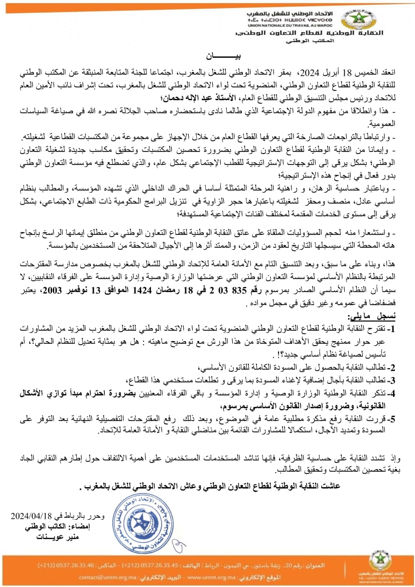 النقابة الوطنية لقطاع التعاون الوطني تطالب بالمزيد من المشاورات حول ورش النظام الأساسي