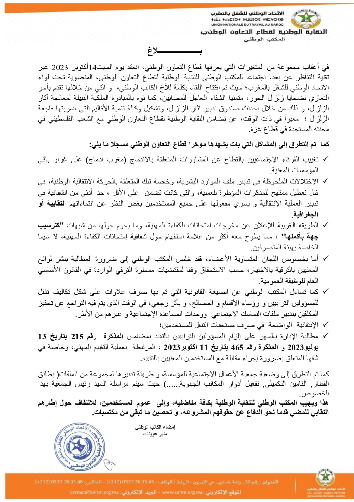وأهاب المكتب الوطني للنقابة الوطنية بكافة مناضلي النقابة، وإلى عموم المستخدمين، للالتفاف حول إطارهم النقابي للمضي قدما نحو الدفاع عن حقوقهم المشروعة، و تحصين ما تبقى من مكتسبات.