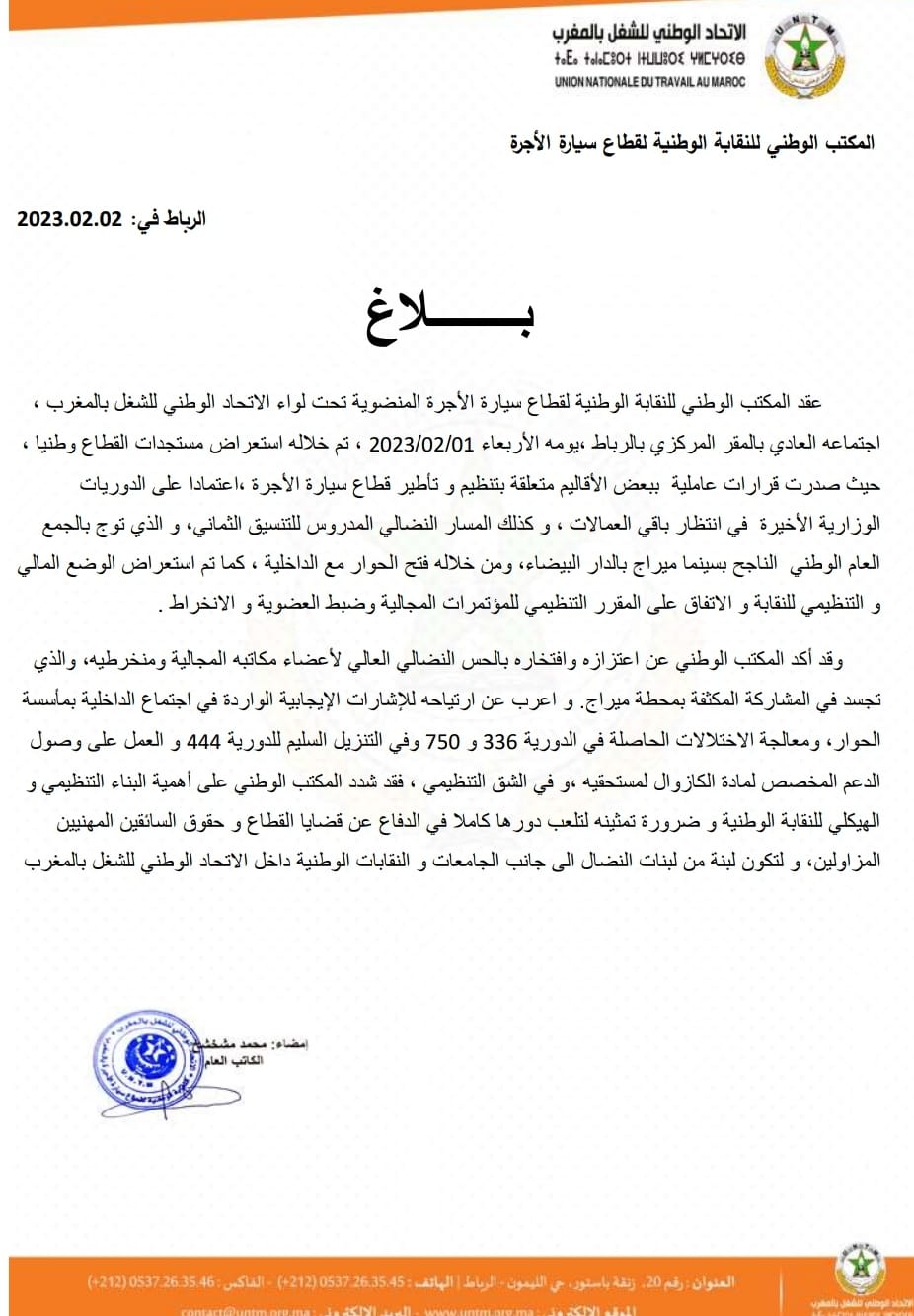 وسجلت النقابة خلال اجتماع مكتبها الوطني، الأربعاء 1 فبراير 2023، اعتزازها و افتخارها بالحس النضالي العالي لأعضاء مكاتبها المجالية و منخرطيها، و الذي تجسد في المشاركة المكثفة بمحطة ميراج.