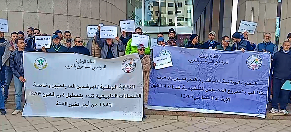 نظّمت النقابة الوطنية للمرشدين السياحيين، يوم الثلاثاء 15 دجنبر 2025، وقفة احتجاجية أمام مقر وزارة السياحة بالعاصمة الرباط، للمطالبة بالإسراع في إصدار النصوص التنظيمية المتعلقة بمهنة المرشد السياحي.