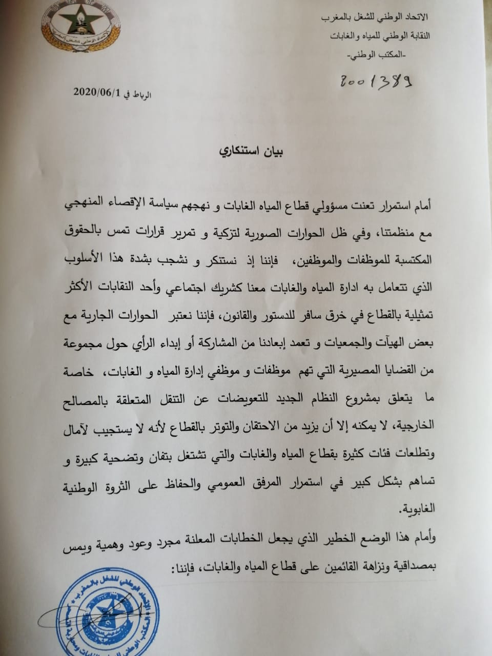 النقابة الوطنية للمياه والغابات تستنكر استمرار تعنت مسؤولي قطاع المياه الغابات ونهجهم سياسة الإقصاء