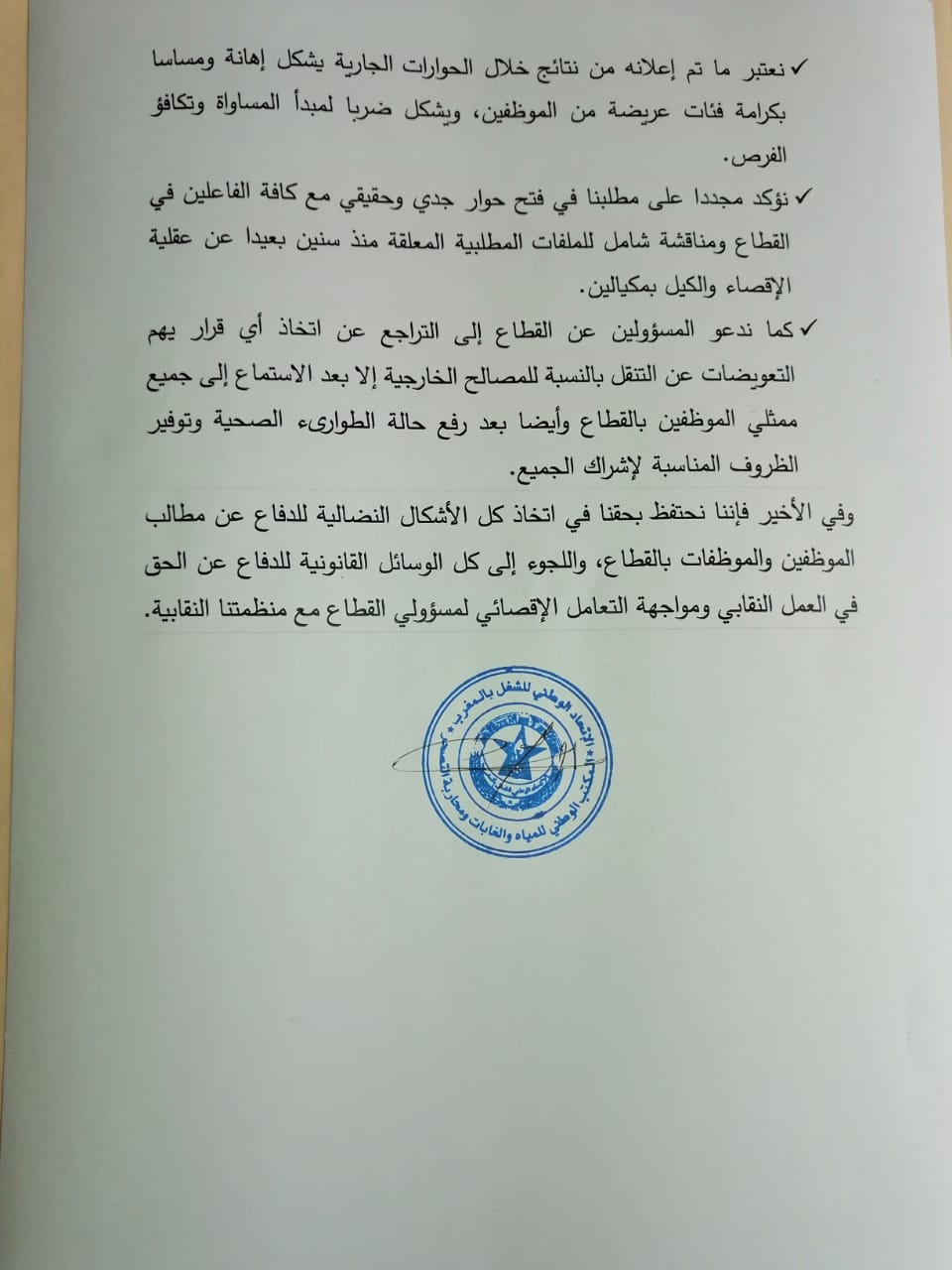 وأكدت النقابة حقها في الاحتفاظ باتخاذ كل الأشكال النضالية للدفاع عن مطالب الموظفين والموظفات بالقطاع، واللجوء إلى كل الوسائل القانونية للدفاع عن الحق العمل النقابي ومواجهة التعامل الإقصائي لمسؤولي القطاع مع النقابة.