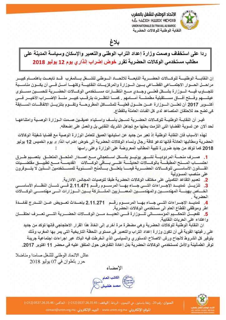 دعت النقابة الوطنية للوكالات الحضرية المنضوية تحت لواء الاتحاد الوطني للشغل بالمغرب، كافة رجال ونساء الوكالات الحضرية إلى خوض إضراب إنذاري يوم الخميس 12 يوليوز 2018، ردا على استخفاف وصمت وزارة إعداد التراب الوطني والتعمير والإسكان وسياسة المدينة على مطالب المستخدمين.