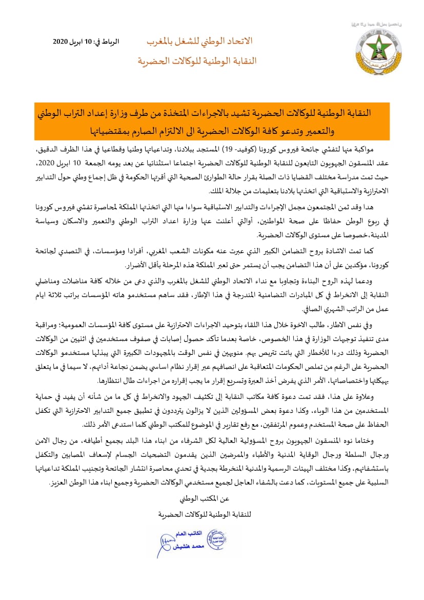 مواكبة منها لتفشي جائحة فيروس كورونا (كوفيد- 19) المستجد ببلادنا، وتداعياتها وطنيا وقطاعيا في هذا الظرف الدقيق، عقد المنسقون الجهويون التابعون للنقابة الوطنية للوكالات الحضرية المنضوية تحت لواء الاتحاد الوطني للشغل بالمغرب، اجتماعا استثنائيا عن بعد، يومه الجمعة 10 ابريل 2020.